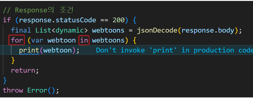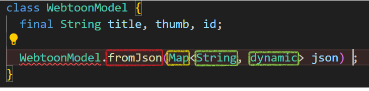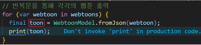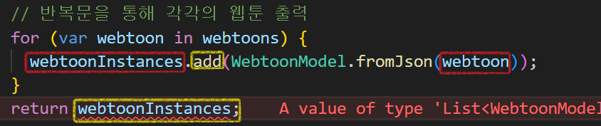 WebtoonModel.fromJson(webtoon)를 넣어준다.