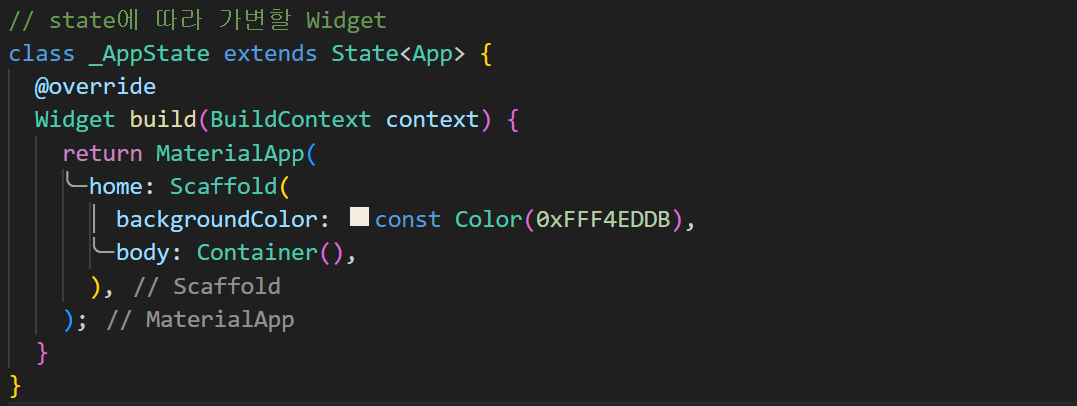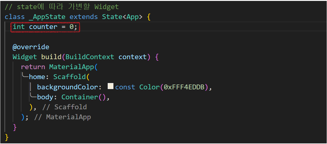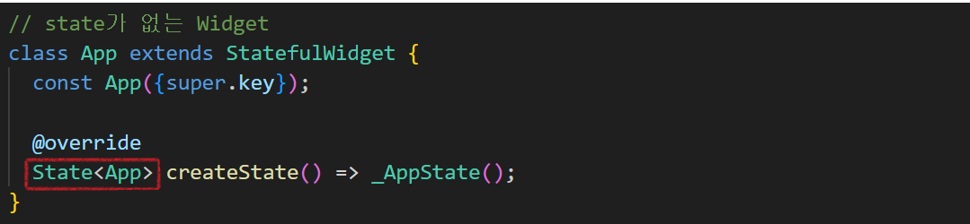 Stateful Widget은 두 부분으로 나뉜다.1. state가 없는 위젯 그 자체2. state에 데이터가 들어와 가변하는 위젯