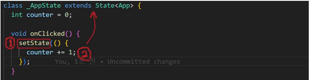 setState()가 먼저 State 클래스에게 변동된 값을 전달하고counter 변수는 1을 더하게 된다.