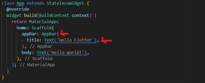 AppBar를 title의 Text로 정의하고Scaffold의 body를 Text로 정의해서 결과를 보면?