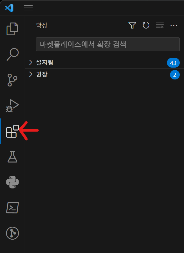 VScode의 확장에 들어간다.( 굉장이 코딩에 유용한 도구들을 설치할 수 있다. )