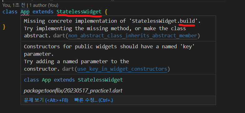 Flutter SDK에 있는 3개의 core Widget중 하나를 상속( extend )받아야 한다.