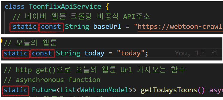 ToonflixApiService 클래스의변수와 함수를 static으로 바꿔준다.